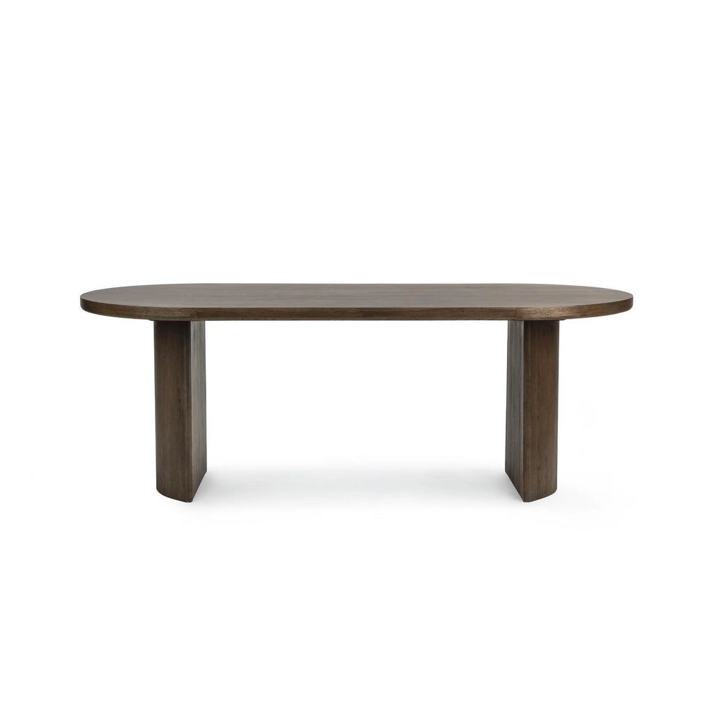 Crafted from relaimed oak veneer. A smooth oval top paired with bold pedestals create a modern design. Imported