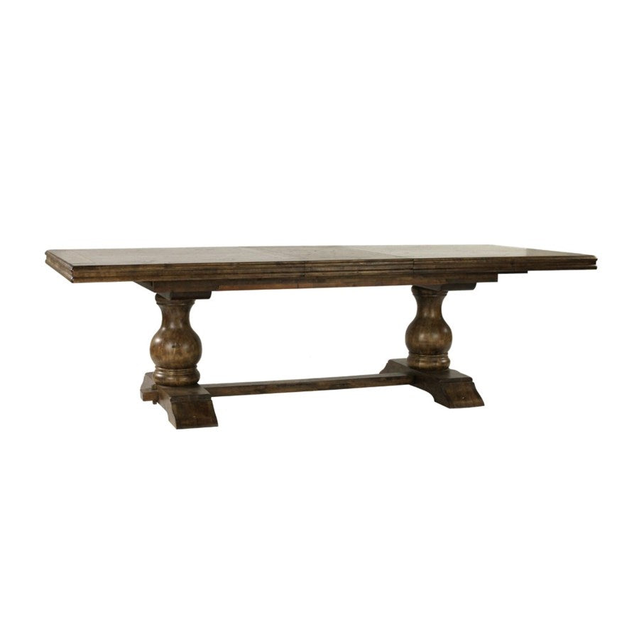 The Tuscany Extension Table is hand-crafted from solid birch and finished with a rich Chestnut stain. Each table is uniquely distressed to accentuate its natural beauty and sealed for worry-free use. All materials and construction are of the highest quality to assure both durability and functionality. The Tuscany Extension Table extends from 84" to 106" (one leaf) to 128" (two leaves) in length. One of the leaves self-stores inside the table. Imported.