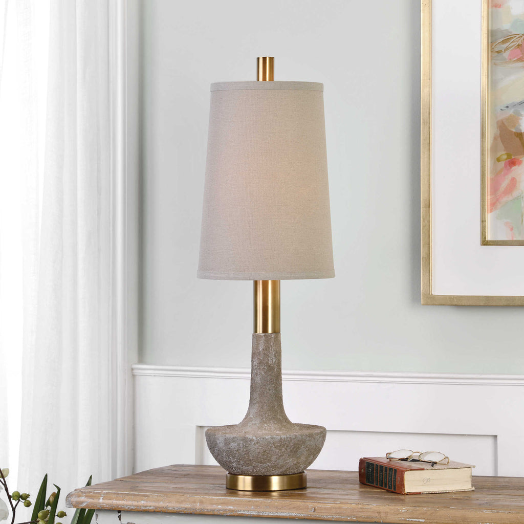 Textured stone base with plated brushed brass accents. Tapered hardback shade in oatmeal linen fabric with natural slubbing. 100W max. UL listed. Imported