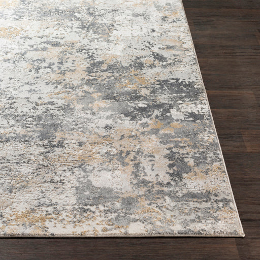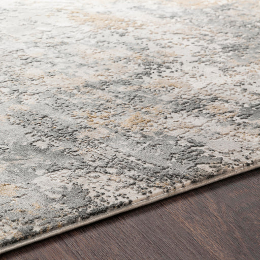 Machine-woven area rug. Crafted from durable and resilient 70% viscose and 30% acrylic. Low 0.31" pile. Charcoal, gray, light gray, and mustard colorways. Made in Turkey
