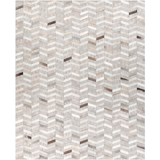 Hand-crafted, using 65% hair-on-hide. No Pile. Felt Backing. Dark brown, camel, light grey, and cream colorway. Made in India.