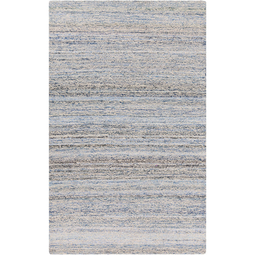 Hand-tufted 50% cotton, 50% wool area rug. Low 0.5" pile. Denim, dark blue, navy, and cream color pallet. Made in India
