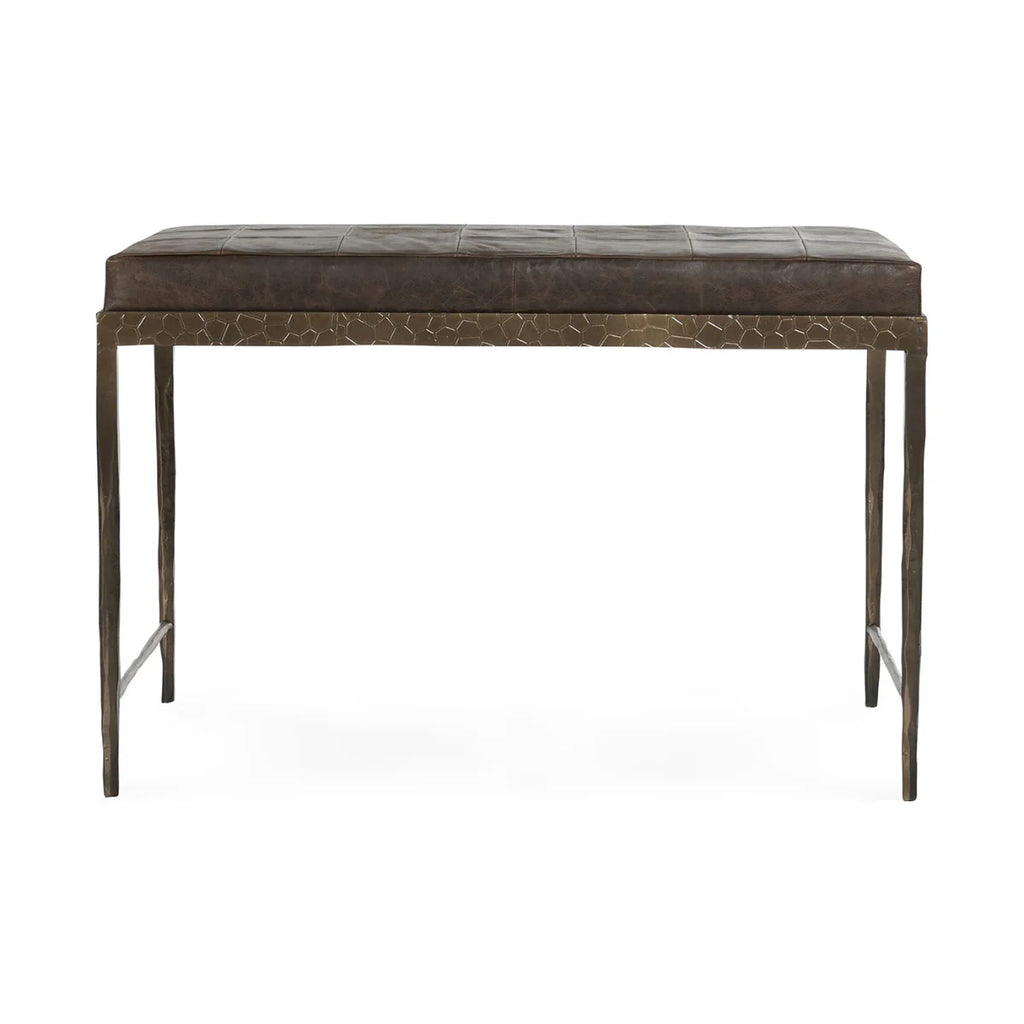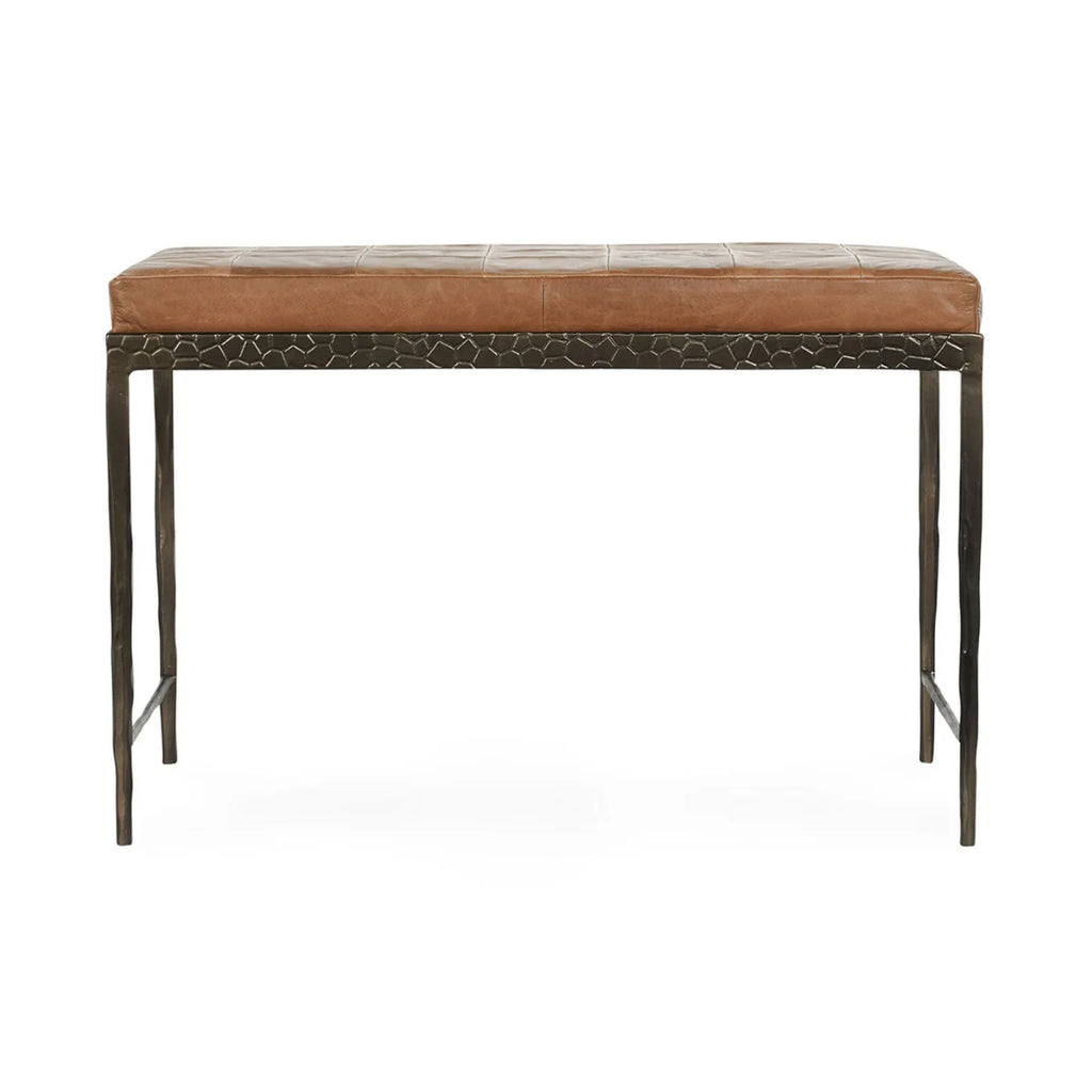 The Loma bench features a luxurious top grain leather seat cushion and a hammered cast iron base. Ideal for any space that calls for a omfortable place to sit and an eye-catching design accent. Availabe in black, cocoa, and brown. Imported