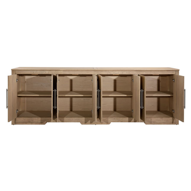 Crafted from solid rubberwood with an oak veneer with a natural finish with brushed nickel handles. Each compartment has a removable shelf. Made in Vietnam.