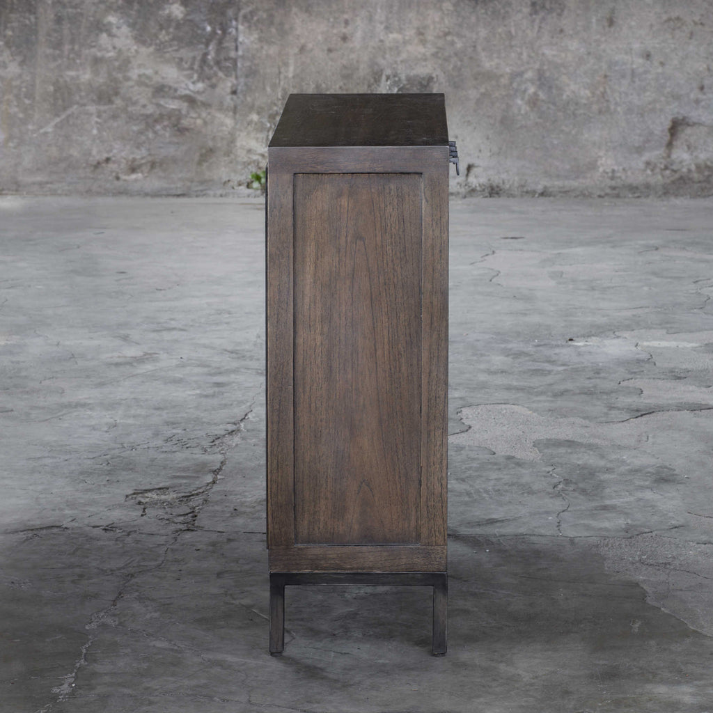 Perfect for small spaces, this shallow console features contemporary lines with and a soft walnut finish. An aged steel base and coordinating door handles complete the understated, timeless appeal of this cabinet. Includes two adjustable shelves. Imported