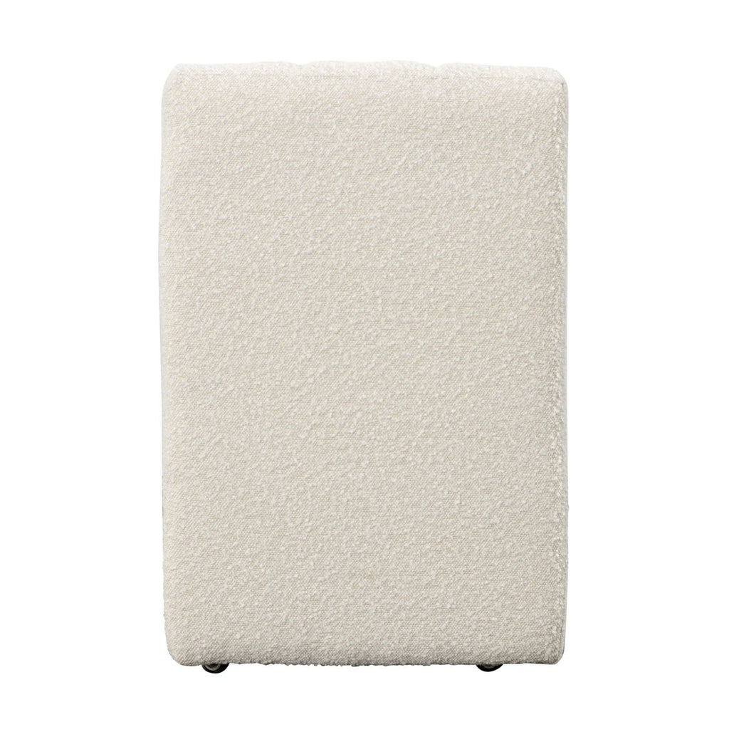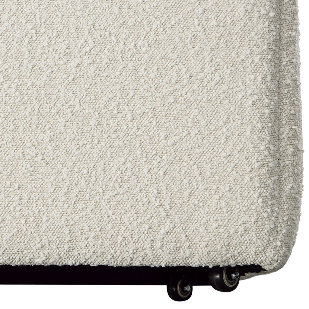 Solid pine frame upholstered in a Boucle Cream performance fabric for durability and cleanability. Includes casters for easy mobility. Imported