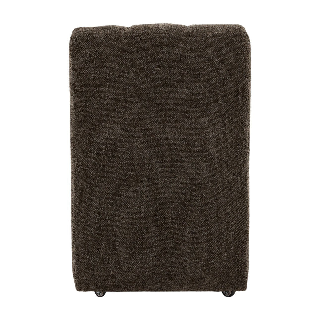 Solid pine frame upholstered in a Chenille Olive 100% polyester fabric for durability and cleanability. Includes casters for easy mobility. Imported
