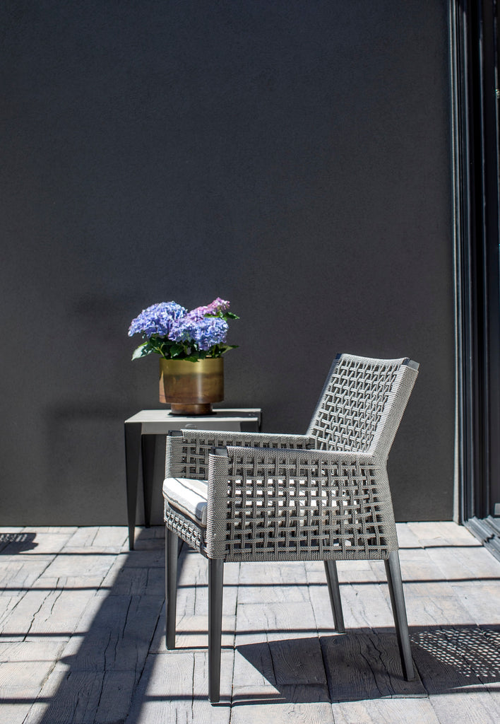 Hand-woven from weather-resistant polypropylene rope material. Powder-coated aluminum frames provide strength and durability for any weather condition. Cushions are specifically engineered for outdoor use and covered in a wide selection of durable outdoor fabrics. Imported